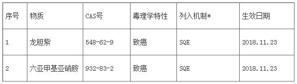 2018年11月23日,美國加州環(huán)境健康危害評估環(huán)保辦公室(OEHHA)發(fā)布公告,正式將“龍膽紫和六亞甲基亞硝胺”添加到加州65有毒有害化學(xué)物質(zhì)清單中。